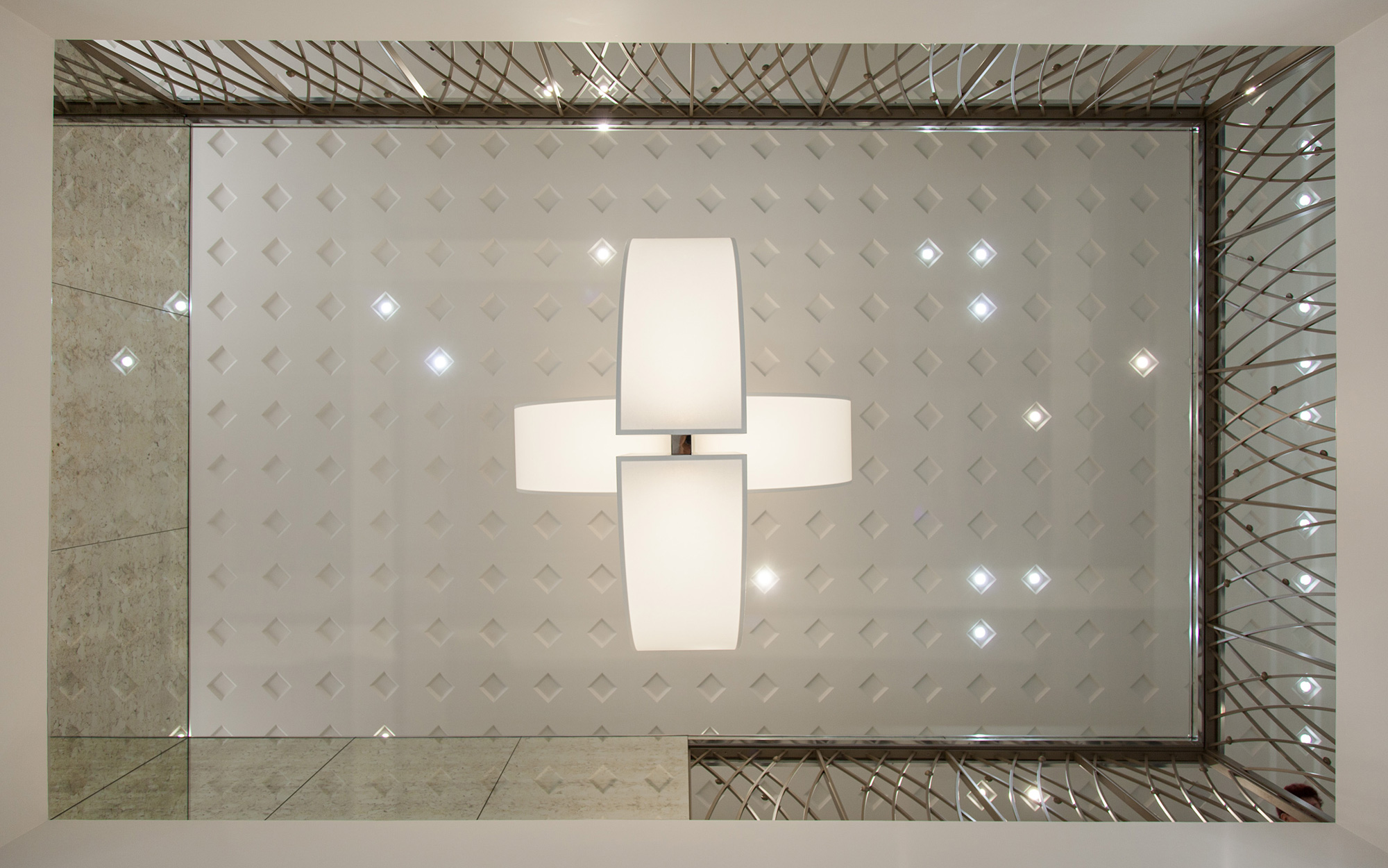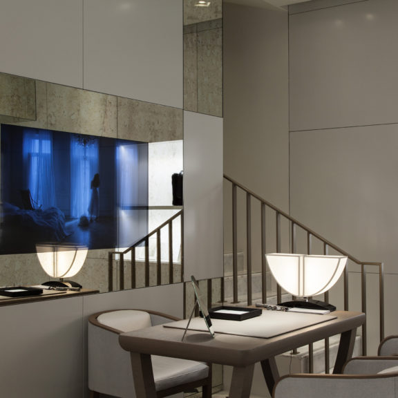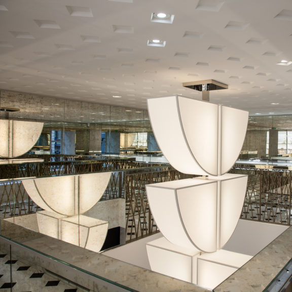 Régis Botta entwarf ein Schaufenster, um die Diamanten und Schmuckstücke der Pariser Mauboussin-Boutique zu präsentieren. Der große Kronleuchter in der Mitte und die maßgefertigten Tischlampen tragen zur einzigartigen Atmosphäre des Ortes bei.