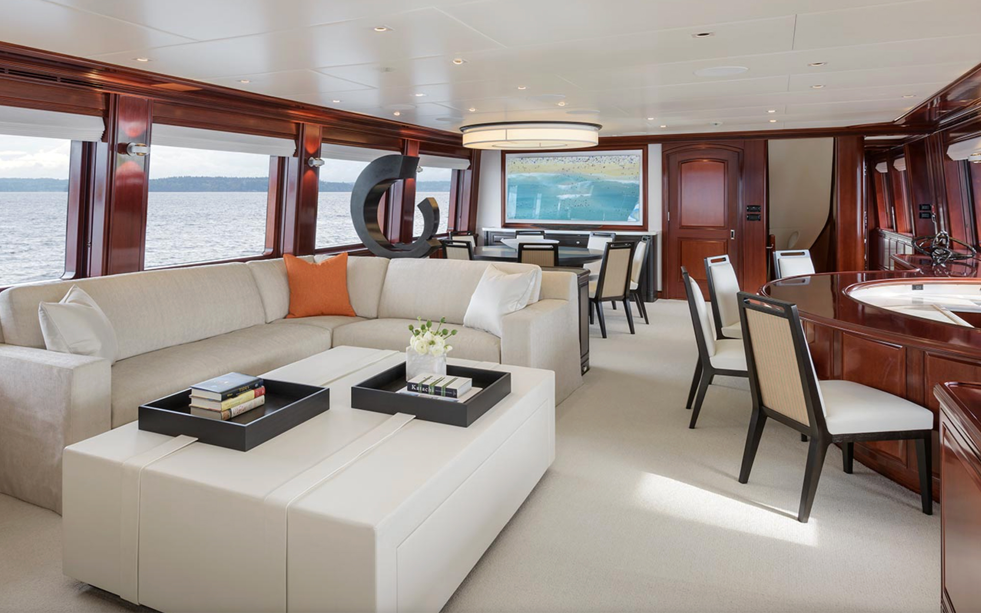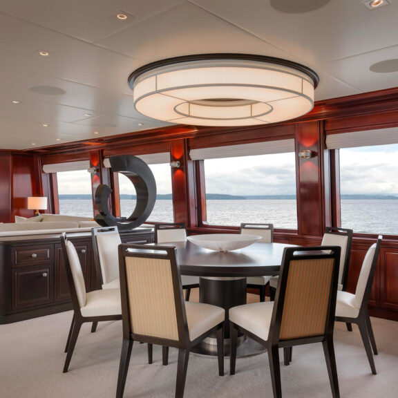 Die Deckenleuchte Line C und die Wandleuchte Brasilia aus Papier bilden einen sanften Kontrast zu den kräftigen Holztönen auf der Yacht MEA CULPA.