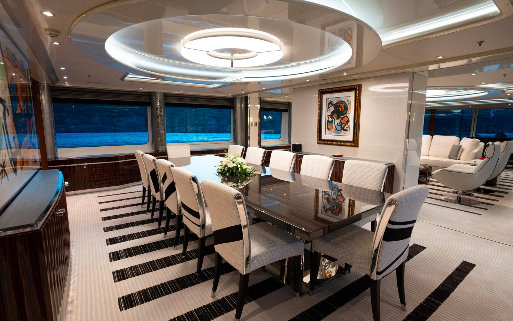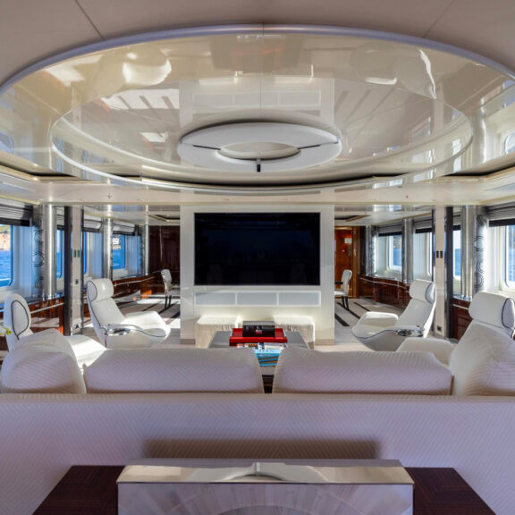 Les plafonniers Luxembourg C de Jean-Michel Wilmotte surplombent le salon et la salle à manger du Yacht ALPHA G ; un projet de yachting réalisé par l’architecte Alexandre Thiriat.